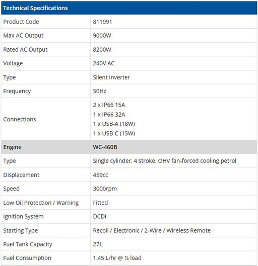 Welling & Crossley WC-P9000Si 9.00kW Ultra-Quiet Smart Inverter Petrol Generator with Pure Sine Wave & Remote Start DOWNLOAD PRODUCT SP...