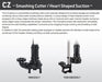 The CZ-series is a submersible smashing cutter pump specially designed for pumping sewage and wastewater containing various solid waste including fibrous materials. A unique design of heart-shaped suction cover equipped with a sharp-edged stationary blade along with an improved semi-open channel impeller having two sharp-edged vanes incorporates the scissor mechanism. This innovative scissor-like mechanism remarkably enhances the solid handling capabilities. It prevents pump clogging through crushing and shredding of solid objects.