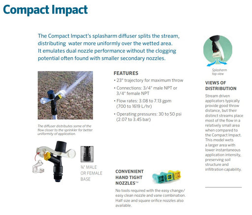 Senninger Compact 20 Series Full Circle 15mm Male Plastic Impact Sprinkler with Single Nozzle and Diffuser DOWNLOAD PRODUCT SPECIFICATIONS T...