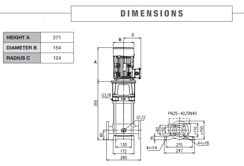 The VMS1-130 is compatible with both AC and DC power sources, making it a flexible solution for standalone solar systems or hybrid configurations. With a compact in-line design and equal-sized inlet and outlet flanges, installation is simple—even in tight or retrofitted pipework systems. The pump is constructed from 304 stainless steel throughout the body, shaft, and impeller to ensure long-lasting durability and corrosion resistance. A graphite and silicon carbide mechanical seal adds to the pump's robust performance in demanding applications.