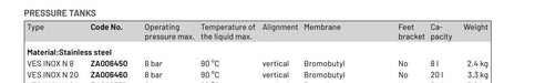 Pentair VES INOX N Series AISI304 Stainless Steel Pressure Tanks (8-20 Litre)